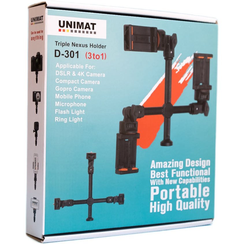 هولدر UNIMAT D-301 یک نگهدارنده سهگانه حرفهای برای نصب همزمان موبایل، میکروفون، نور رینگ یا فلش روی یک پایه است و برای تولید محتوا طراحی شده است.