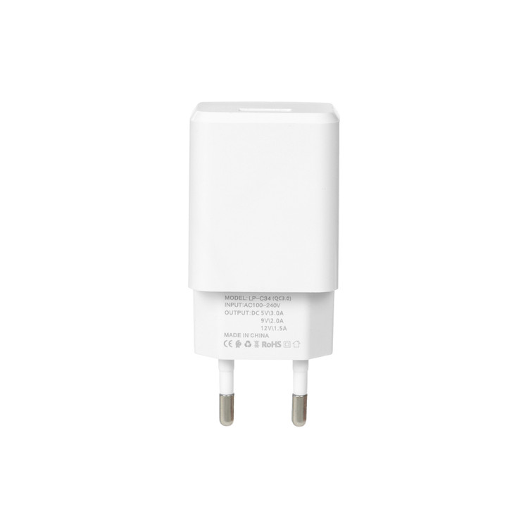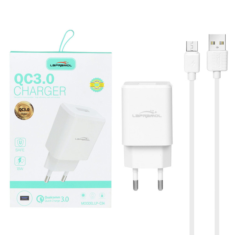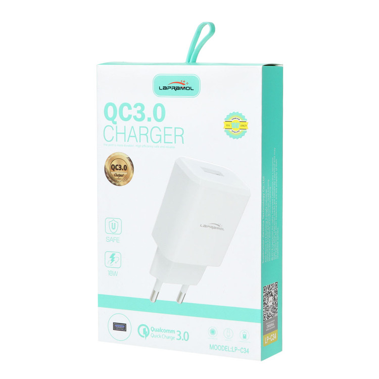 شارژر دیواری Lapramol LP-C34 با توان خروجی ۱۸ وات و پشتیبانی از Quick Charge 3.0، شارژی سریع، پایدار و ایمن را برای گوشیهای هوشمند فراهم میکند.