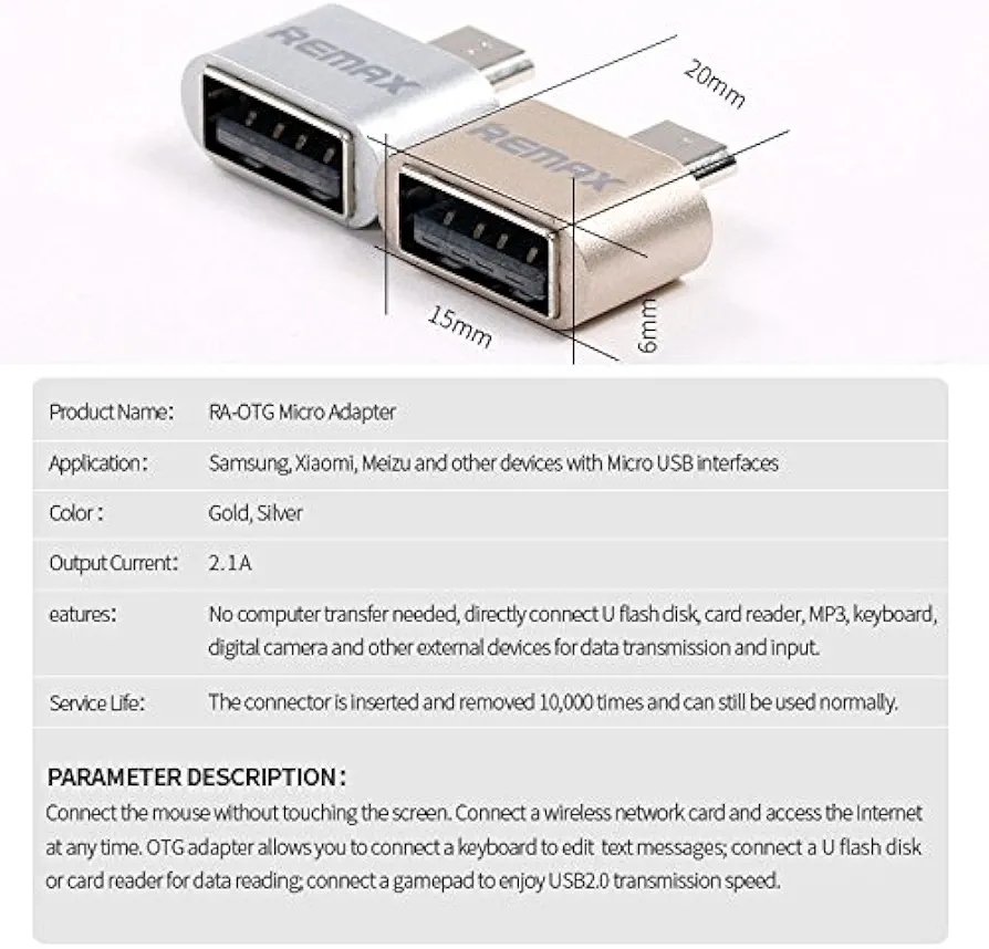 مبدل OTG micro USB ریمکس امکان اتصال فلش، موس، کیبورد و سایر تجهیزات USB را به گوشیها و تبلتهای دارای درگاه micro USB فراهم میکند.