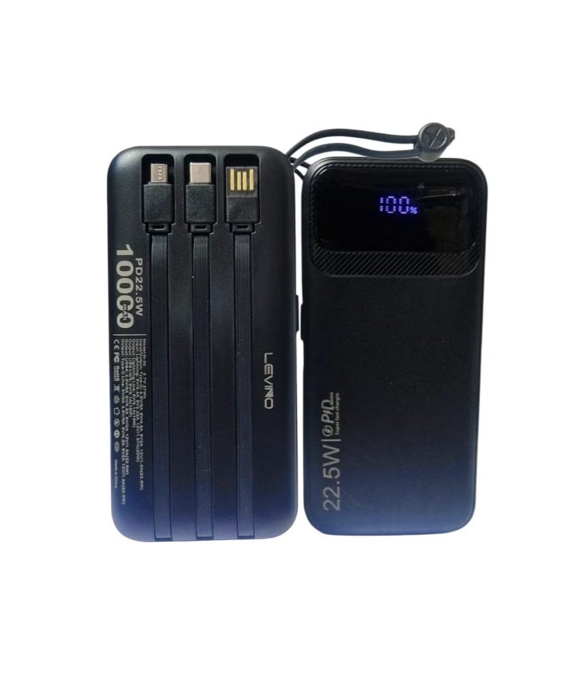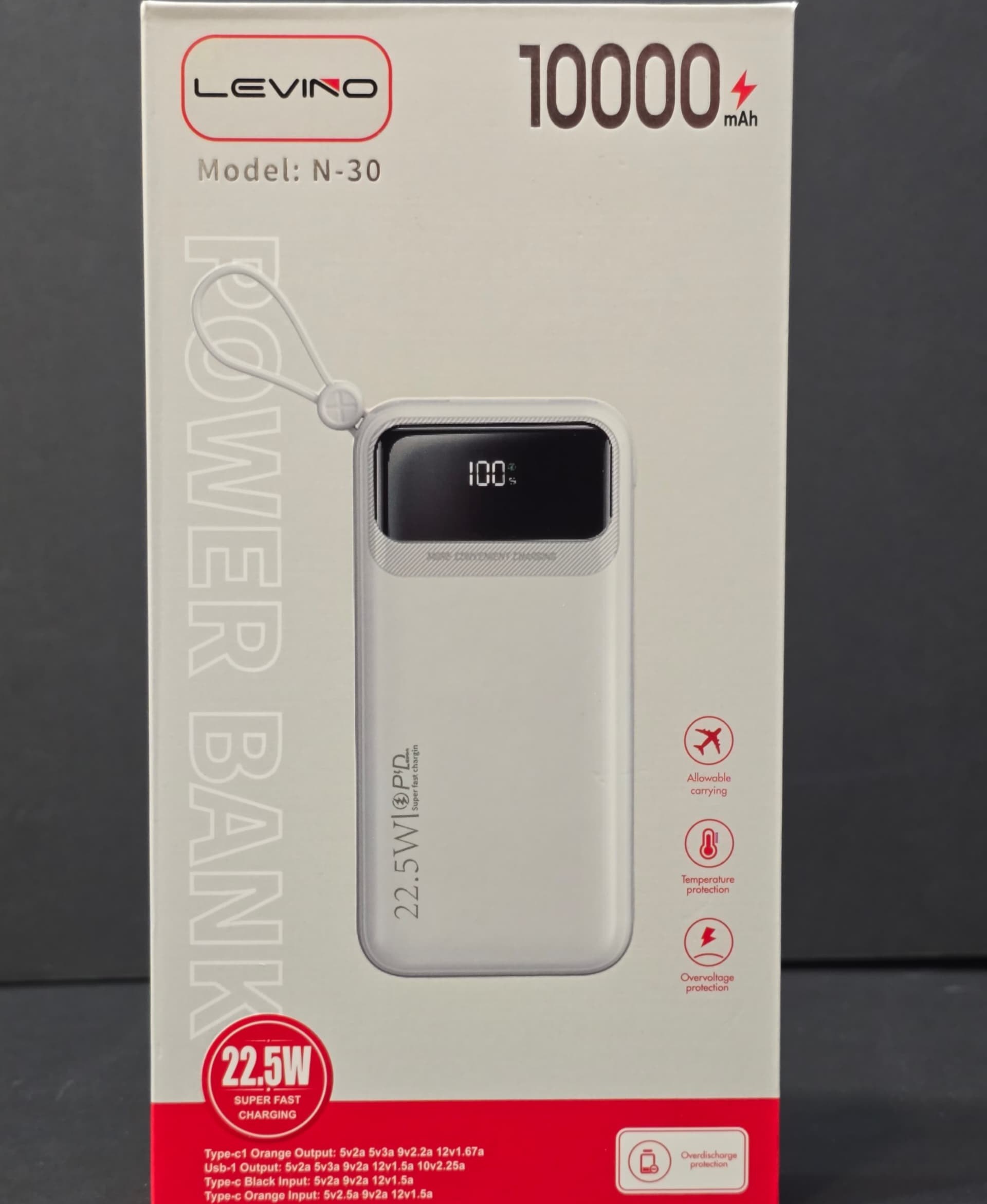 پاوربانک ۱۰۰۰۰ میلیآمپر لوینو N30 با تمرکز بر حمل آسان و سرعت شارژ بالا طراحی شده است. این مدل با پشتیبانی از توان 22.5W امکان شارژ سریع انواع گوشیهای هوشمند، هندزفری بلوتوث و گجتهای دیجیتال را فراهم میکند.