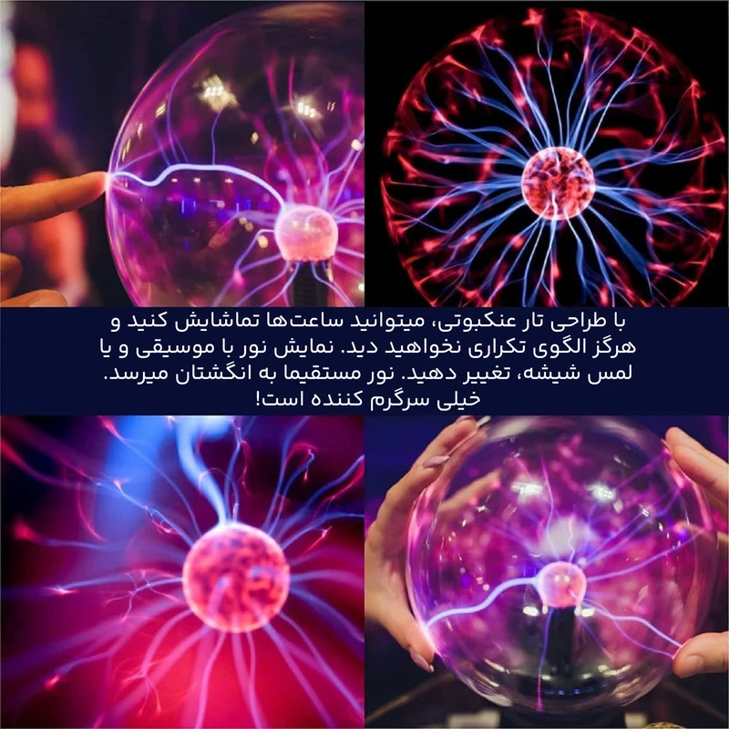 گوی پلاسما لمسی با جلوههای نوری الکتریکی که با تماس دست واکنش نشان میدهد و فضای محیط را خاص میکند.