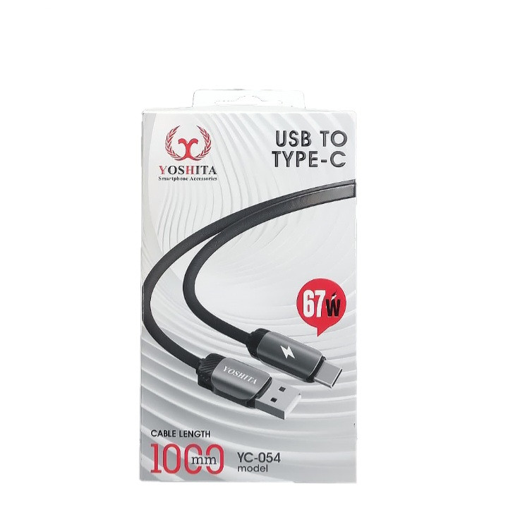 کابل USB به Type-C یوشیتا مدل YC-054 با توان 67 وات واقعی، مناسب شارژ سریع انواع گوشیها و دستگاههای مجهز به پورت تایپ C است.
