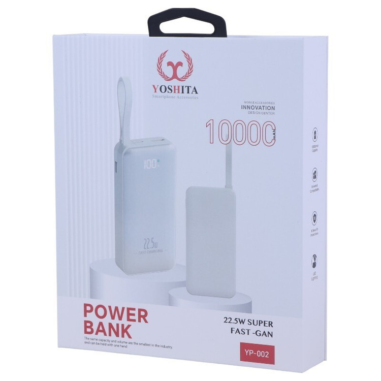 پاوربانک یوشیتا YP-002 با ظرفیت ۱۰۰۰۰ میلیآمپر و توان ۲۲.۵ وات Super Fast، انتخابی ایدهآل برای شارژ سریع و ایمن انواع دستگاههای هوشمند است. استفاده از فناوری GaN باعث افزایش بازده و کاهش حرارت شده است.