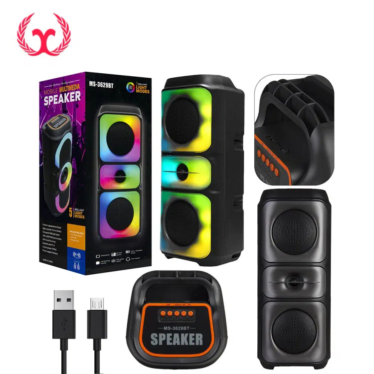 اسپیکر MS-3629BT با طراحی مدرن و نورپردازی RGB چندحالته، گزینهای مناسب برای پخش موسیقی در مهمانیها و استفاده روزمره است. اتصال بلوتوث پایدار و باتری داخلی، کاربری آن را ساده و لذتبخش میکند.