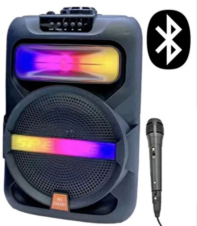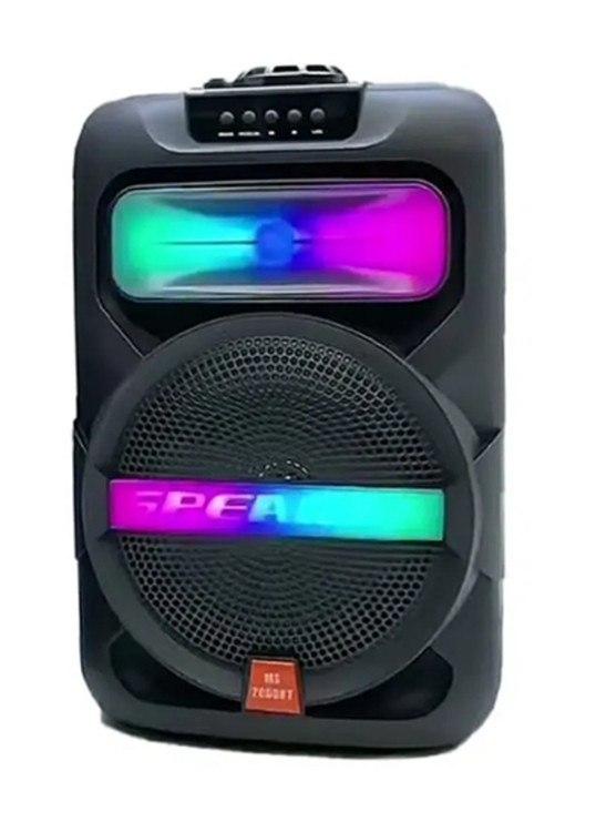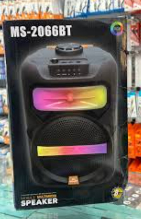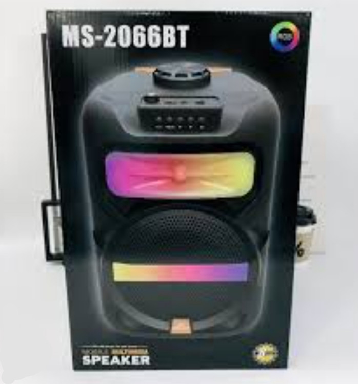 اسپیکر MS-2066BT یک اسپیکر بلوتوثی پرقدرت با طراحی بزرگ، نورپردازی RGB و قابلیت پخش موسیقی از منابع مختلف است که برای مهمانیها و استفاده خانگی طراحی شده است.